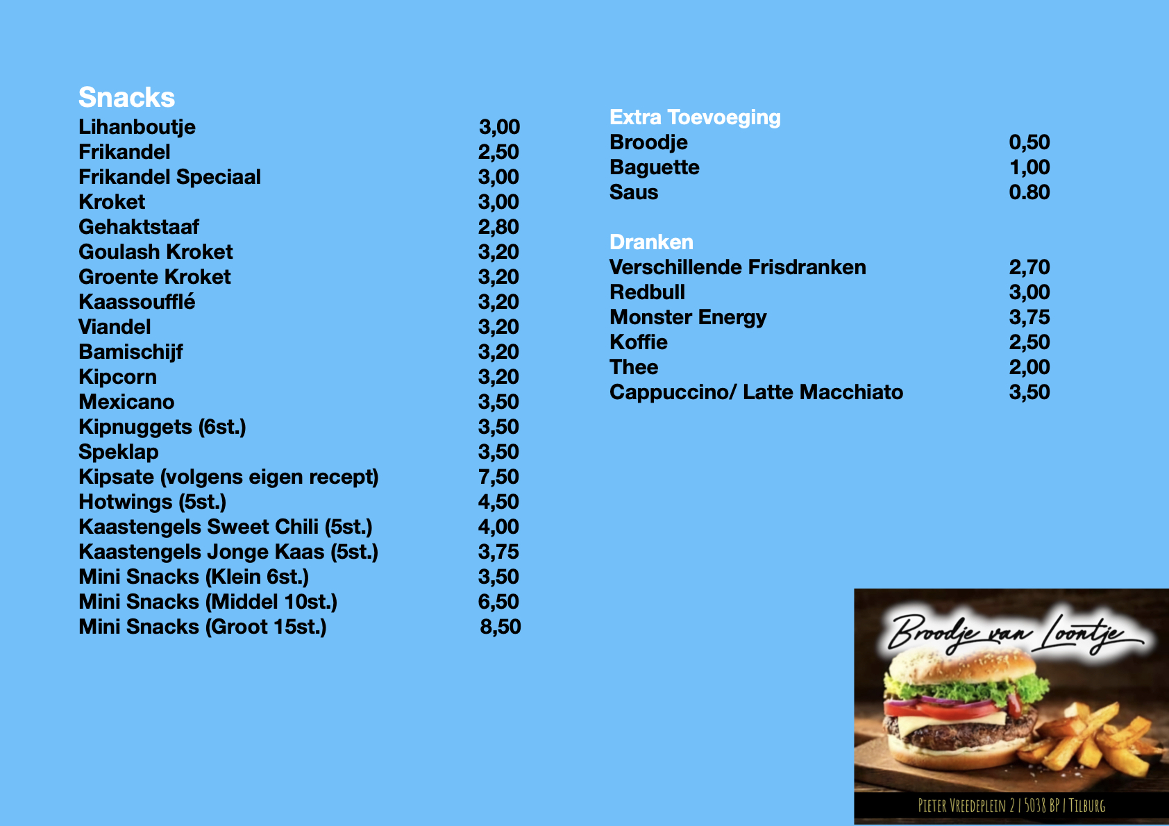Broodje van Loontje is een snackbar gevestigd in het hart van Tilburg. Al jarenlang serveren we de lekkerste snacks en broodjes aan onze klanten. Ons team bestaat uit gepassioneerde medewerkers die elke dag met liefde en zorg de meest smaakvolle gerechten bereiden. Kwaliteit en klanttevredenheid staan bij ons hoog in het vaandel. We gebruiken alleen de beste en meest verse ingrediënten voor al onze producten, zodat je altijd kunt genieten van een heerlijke maaltijd. Of je nu zin hebt in een snelle snack, een vers belegd broodje of een lekker broodje hamburger, bij Broodje van Loontje ben je aan het juiste adres. Kom snel langs en ervaar het zelf!