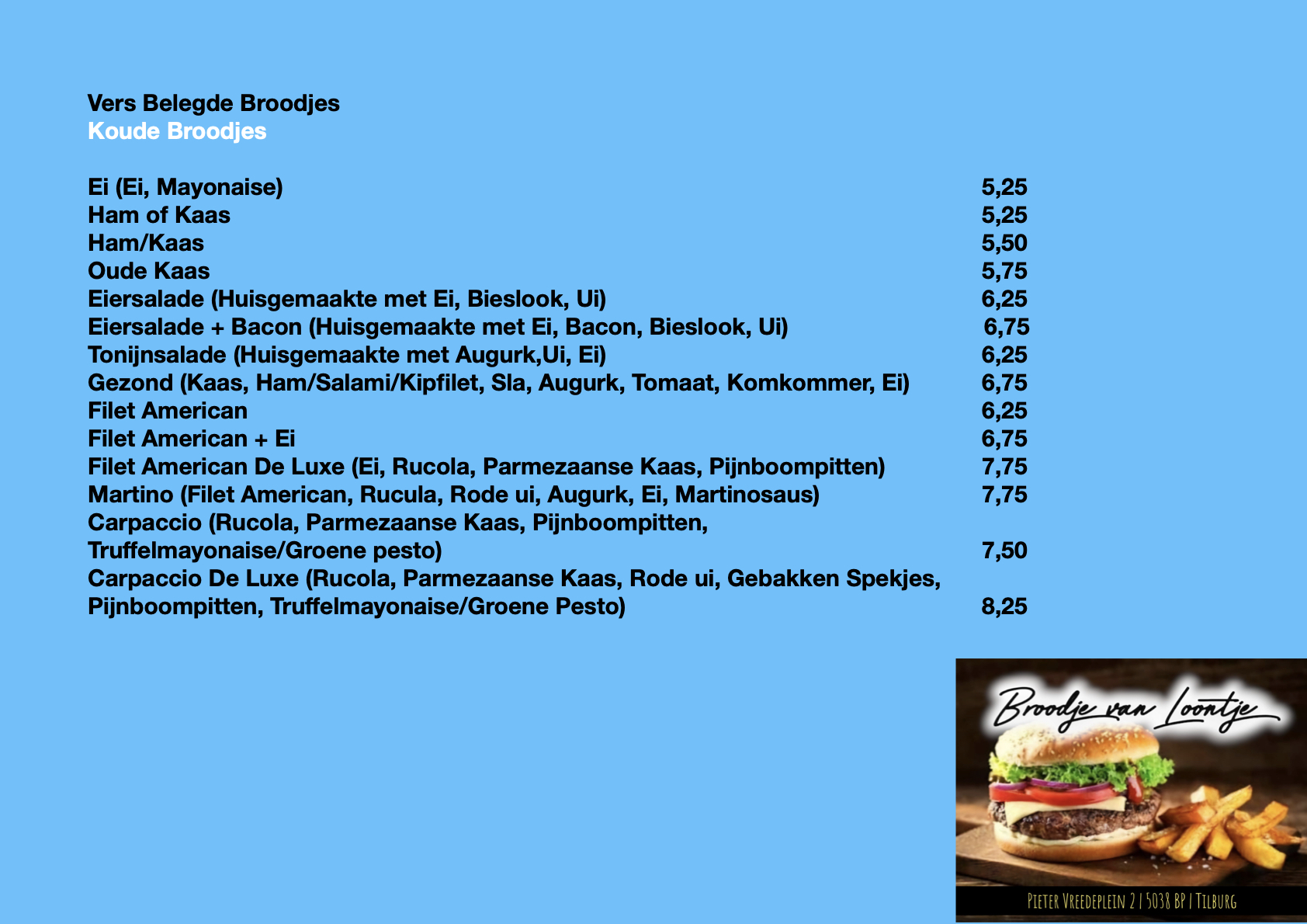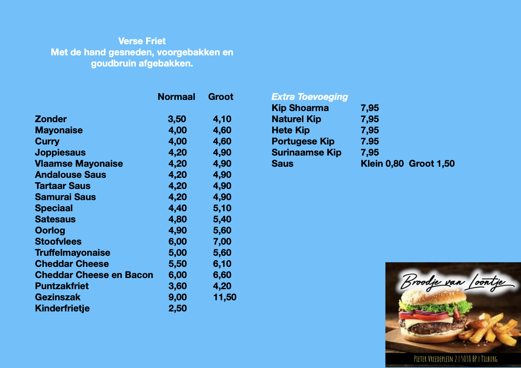 Bij Broodje van Loontje in Tilburg bereiden we elke dag de meest heerlijke broodjes hamburger, snacks, verse friet en vers belegde broodjes.